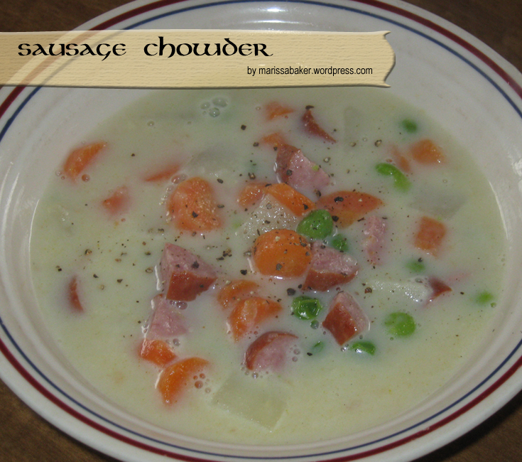 Meanwhile, cut turkey sausage into cubes. Add sausage, chicken base, and onion powder when mixture in pot boils. Reduce heat and simmer till carrots and potatoes are done.