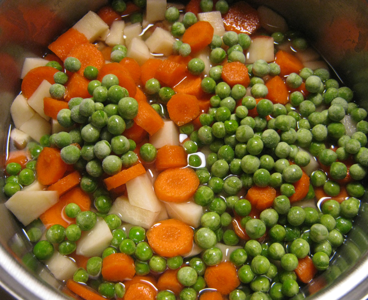 Place chopped potatoes, carrots, and peas in a large sauce pan. Add 2 cups water and bring to a boil.
