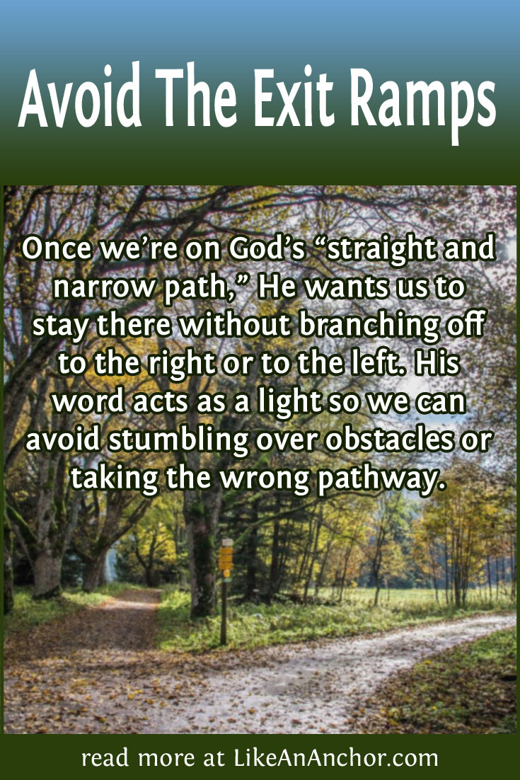 I chose the title “Avoid The Exit Ramps” for this post because once we’re on this path, God intends for us to stay there. We might veer off into one ditch or another, but when we turn to Him with repentance and ask for help He puts us back on track. He also promises that no one who follows Him will be snatched away by some outside force (John 6:37; 10:28-29; Phil. 1:6). The only way for us to get off this path is by our own doing; we can choose to take an exit ramp and reject what God started in our lives (Heb. 6:4-6; 10:26-31; 12:25).