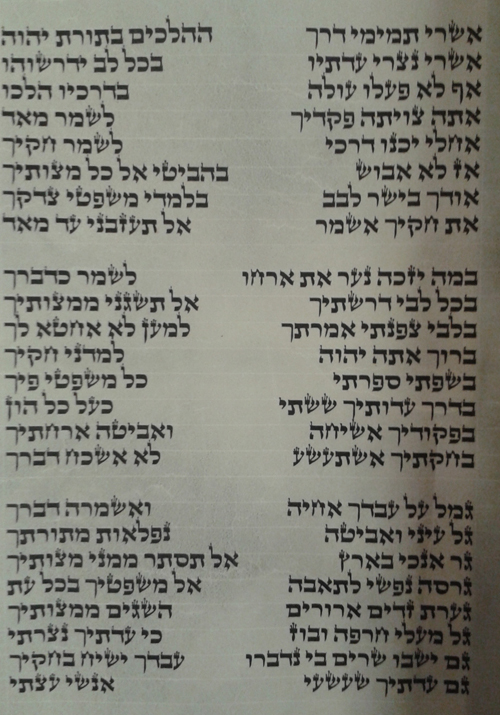 The beginning of Psalm 119 on a scroll written in 2009. Notice you can see the lines are written in sets of 8, each starting with the same Hebrew letter (that’s why it’s divided alphabetically in your English Bibles; because of the type of poem/song it is)