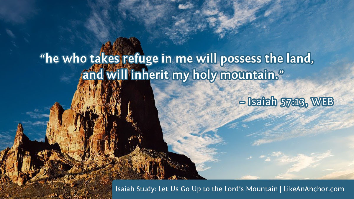 The Lord’s mountain is linked with Millennial imagery again in Isaiah chapter 11, where Gods says, “They will not hurt nor destroy in all my holy mountain” (Is. 11:9, WEB). In the future, even foreigners and outcasts “will worship Yahweh in the holy mountain at Jerusalem” (Is. 27:13, WEB); a worship that’s also associated with joy in keeping God’s holy festivals (Is. 30:29). By the time Isaiah’s readers get to the last 27 chapters that we’ve been studying, they’ve already heard quite a bit about God’s holy mountain.