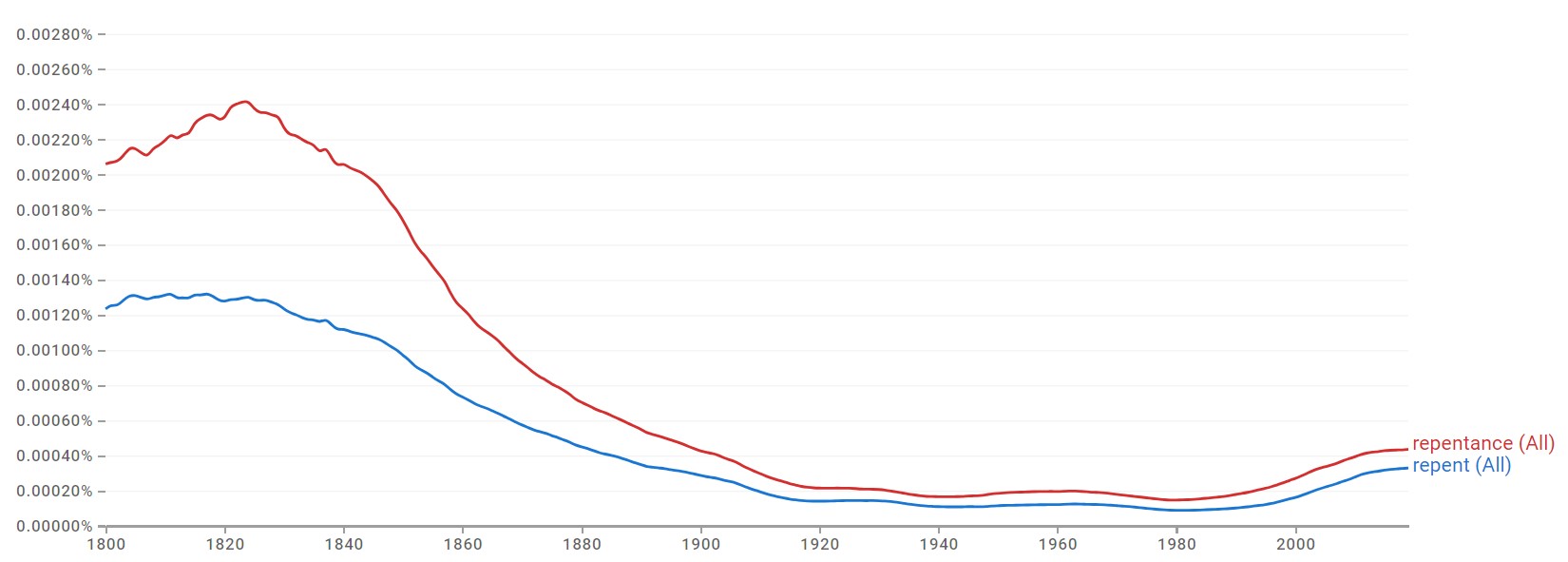 According to Oxford Languages (via Google), “repent” means “feel or express sincere regret or remorse about one’s wrongdoing or sin.” It came into Middle English “from Old French repentir, from re- (expressing intensive force) + pentir (based on Latin paenitere ‘cause to repent’).” There’s also something interesting going on with Google’s tracking for how often this word was used in English-language books between 1800 and 2019.