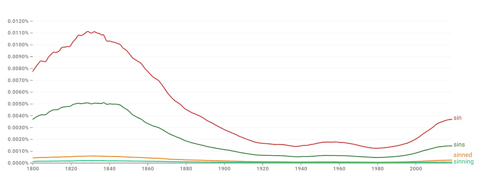 Evidently, repentance is not a popular idea (though I am intrigued by the recent uptick in usage after that slump in the 1900s). I don’t really think it will surprise any of us that “repent” and “repentance” are used less now than they were in the early 1800s. Repentance is something you need to do after you sin, and sin isn’t something we like to think about either. The more moral relativism takes hold in our society, the less people are willing to acknowledge sin is even a real thing since sin is the transgression of (God’s) absolute laws. The chart for “sin” in English language books looks very similar to the one for repentance.
