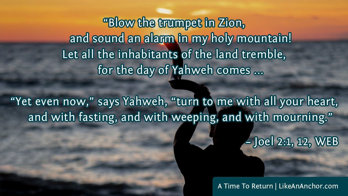 This year, we will observe the Day of Atonement on September 25, 2023. This is a solemn holy day when God commands us to rest completely and “afflict your souls” (traditionally understood to mean fasting). Reading Joel, I can’t help but notice that the trumpet blasts warning that the Messiah’s return is coming closer and closer also call us to fast and repent. God and the prophet Joel call out to readers, saying, “turn (shub) to Yahweh, your God!”