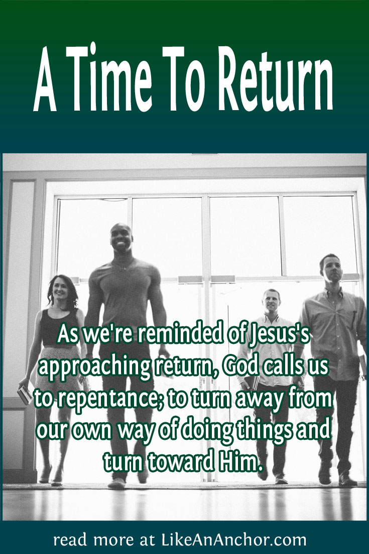 Image of four people walking into a church building with the blog's title text and the words "As we're reminded of Jesus's approaching return, God calls us to repentance; to turn away from our own way of doing things and turn toward Him."